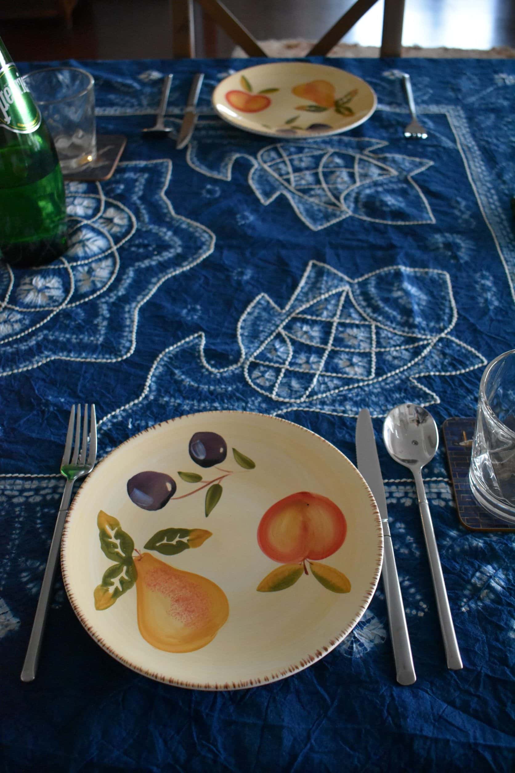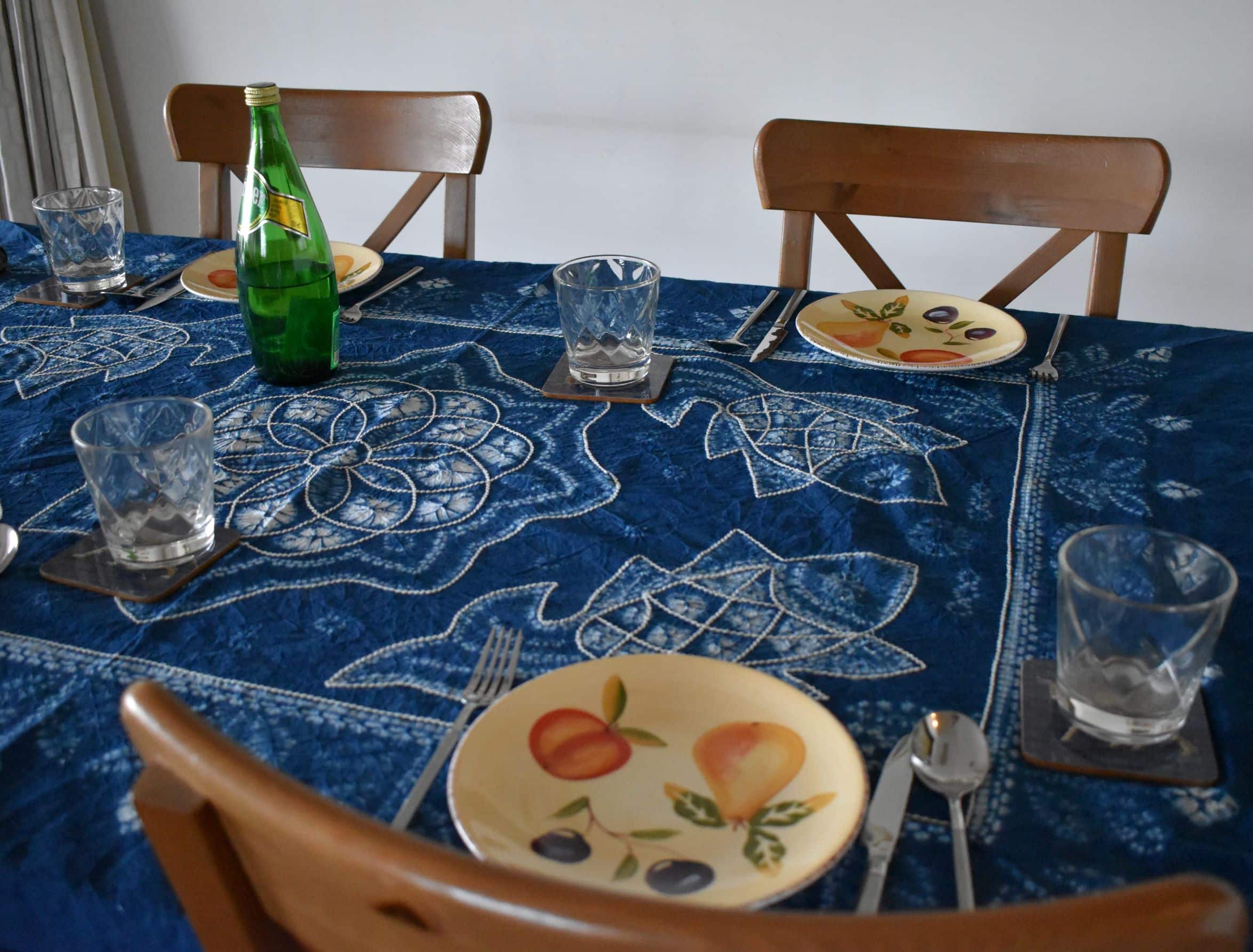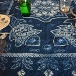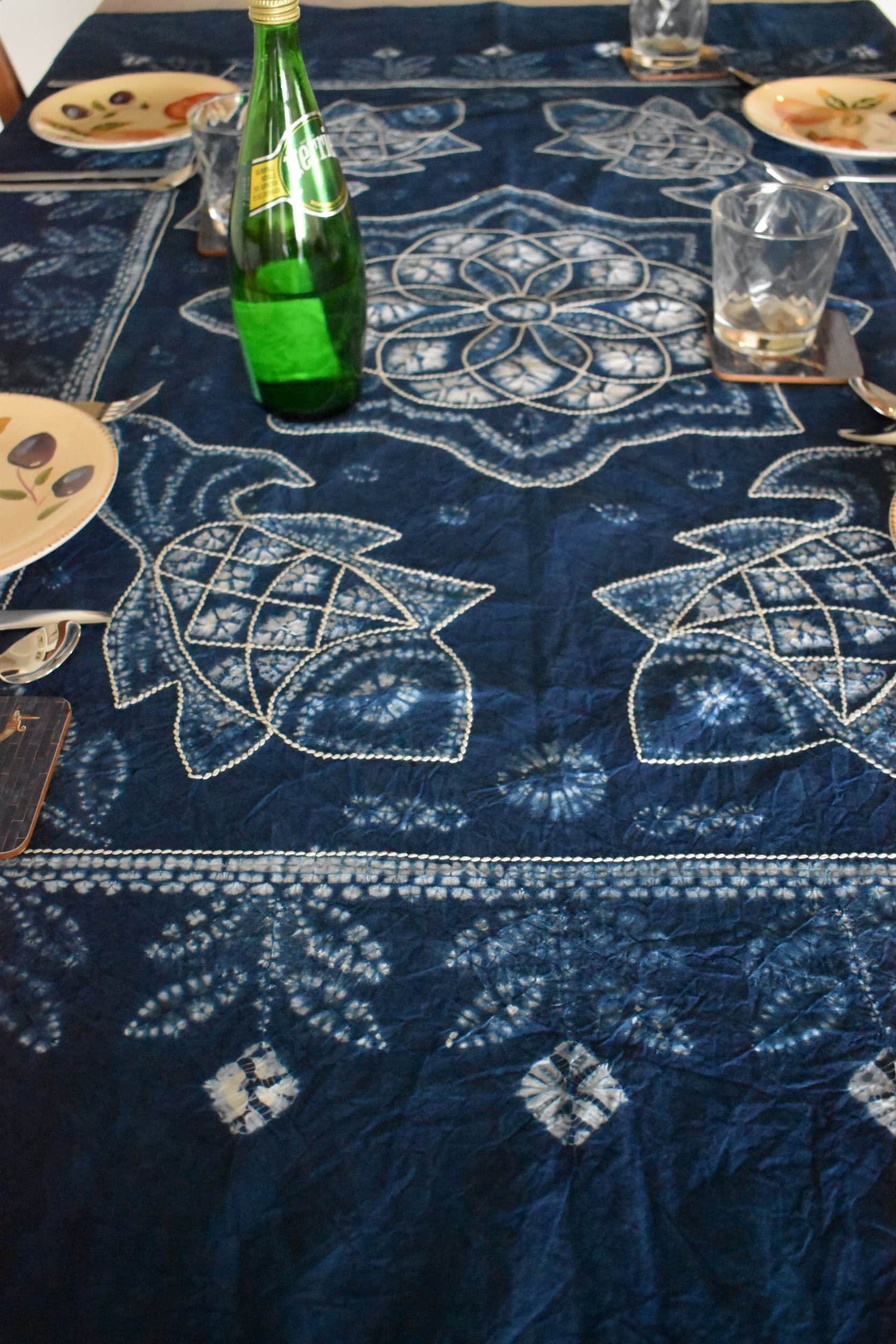 100% cotton tablecloth, tie-dyed with natural indigo using traditional techniques and intricately embroidered by the Bai community.